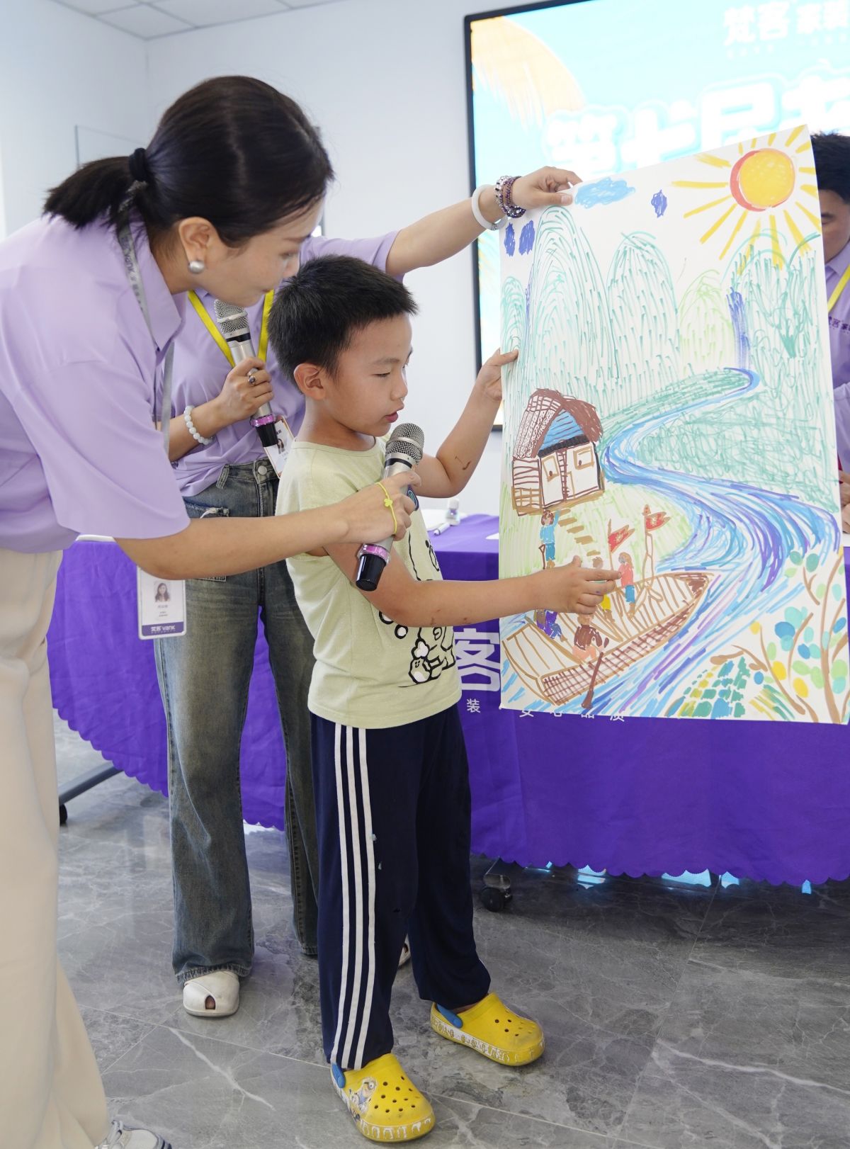 隨后,小朋友向大家講述了自己的繪畫思路,“我畫的是軍艦,可以保家衛國...我希望它能帶我去看這個世界…我想和爸爸媽媽一起去釣魚…我的船順著小溪穿越森林,周圍的風景一定很美…”