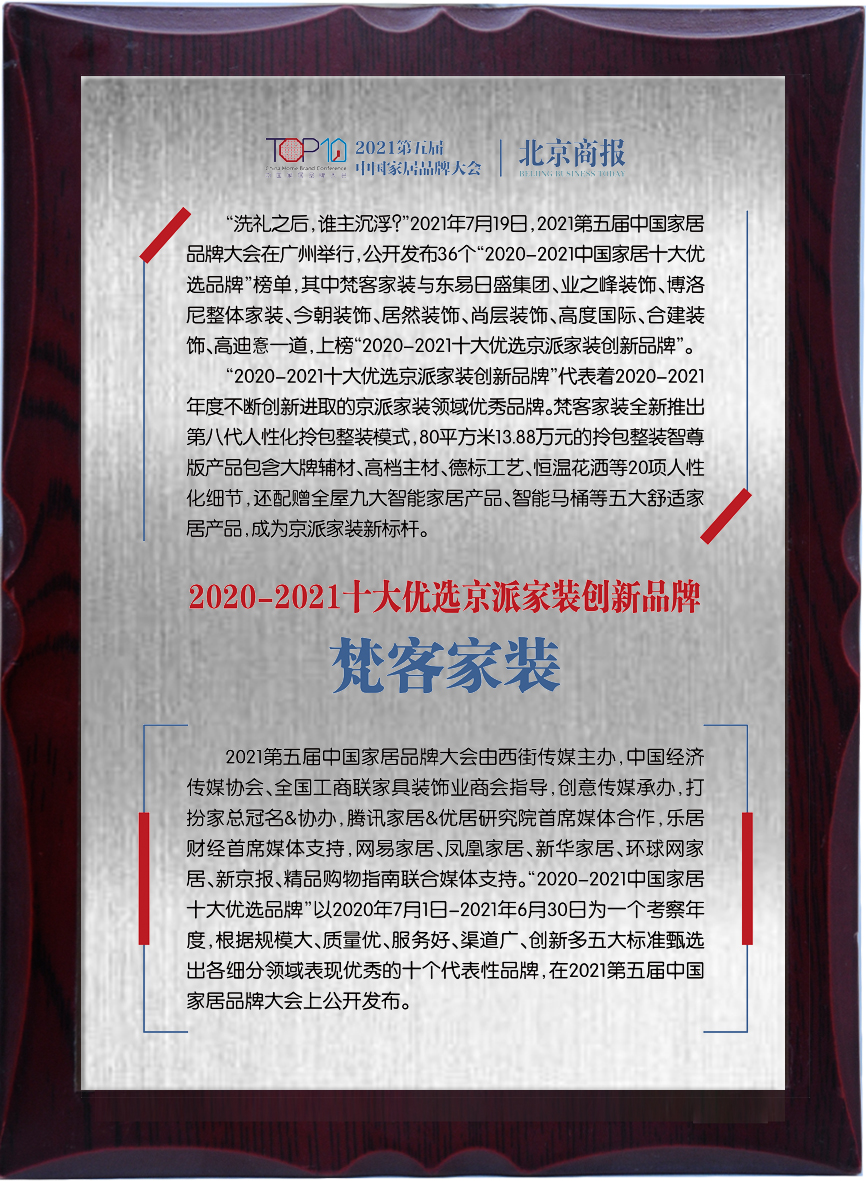 2021年7月19日,2021第五屆中國家居品牌大會在廣州舉行,公開發布36個“2020-2021中國家居十大優選品牌”榜單,其中梵客家裝與東易日盛集團、業之峰裝飾、博洛尼整體家裝、今朝裝飾、尚層裝飾等十大知名裝企上榜“2020-2021十大優選京派家裝創新品牌”。
