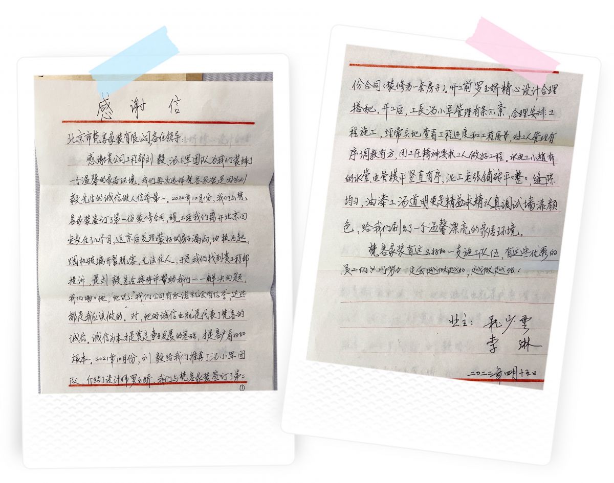 “裝修的新家細致完美,錦旗一個送梵客,一個送工長,代表家裝服務有保障,工地施工有保障。”