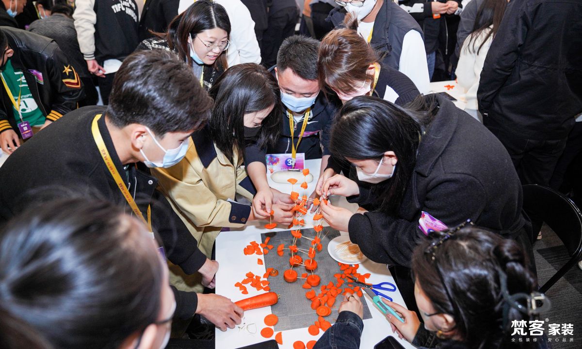 蘿卜塔,主要考核的是組員之間的相互配合精神,大家根據桌子上的工具,將蘿卜切塊、搭建,在規定時間內搭建越高、穩定性越強、支撐越久,就代表勝利。