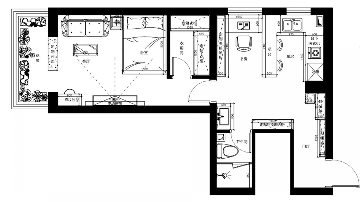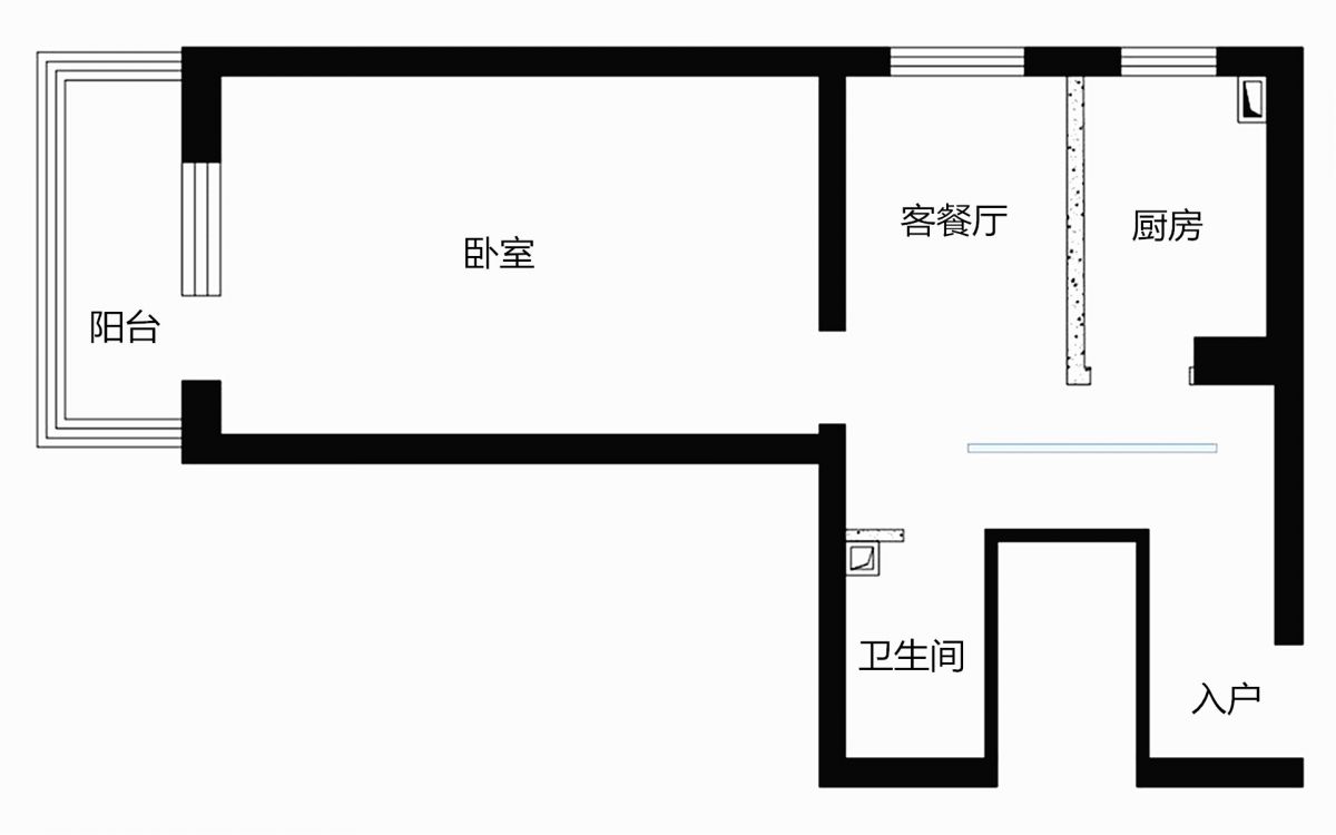改造后,滿足了業主想要的所有功能區,空間利用率大大提升。從原始平面圖 ↑ 和平面布置圖 ↓ 的對比,即可看出變化。