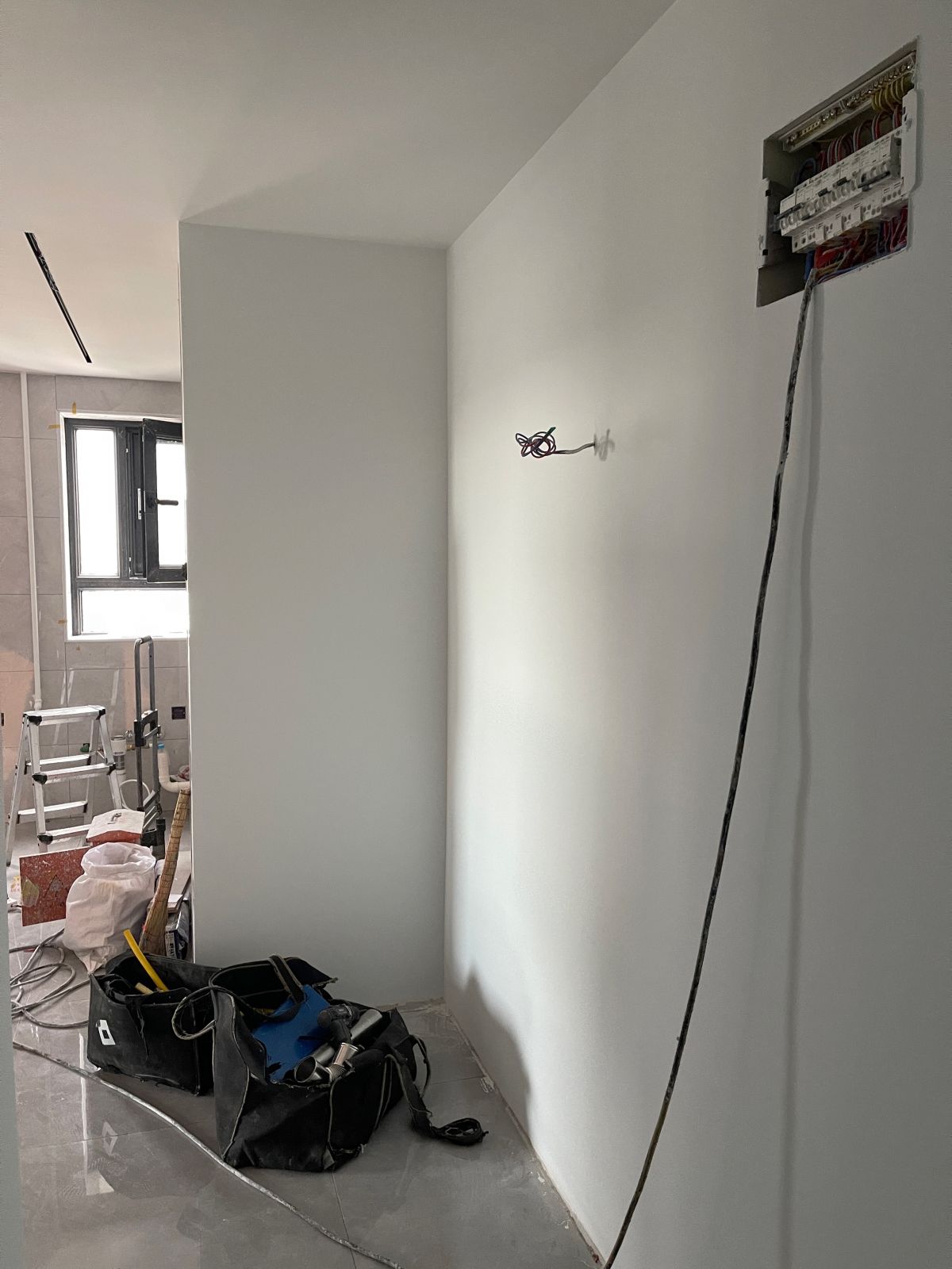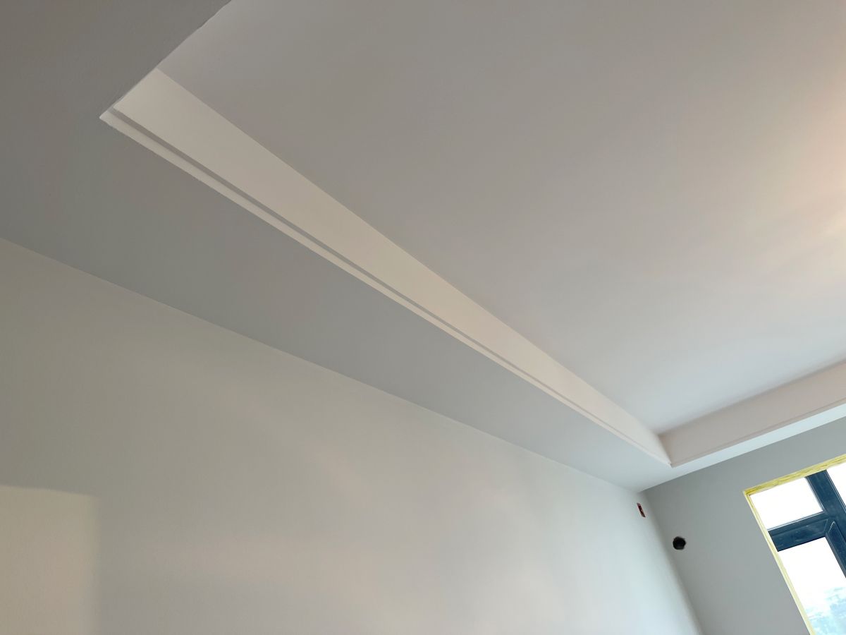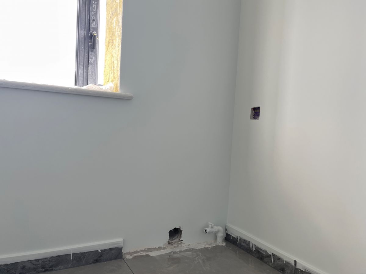 因為有貼墻的柜子,暫時未安裝踢腳線,同時為了配合柜子安裝,保證柜體與墻面緊密貼合、無縫隙,柜子從上到下嚴絲合縫,因此此處墻面做了垂平工藝。