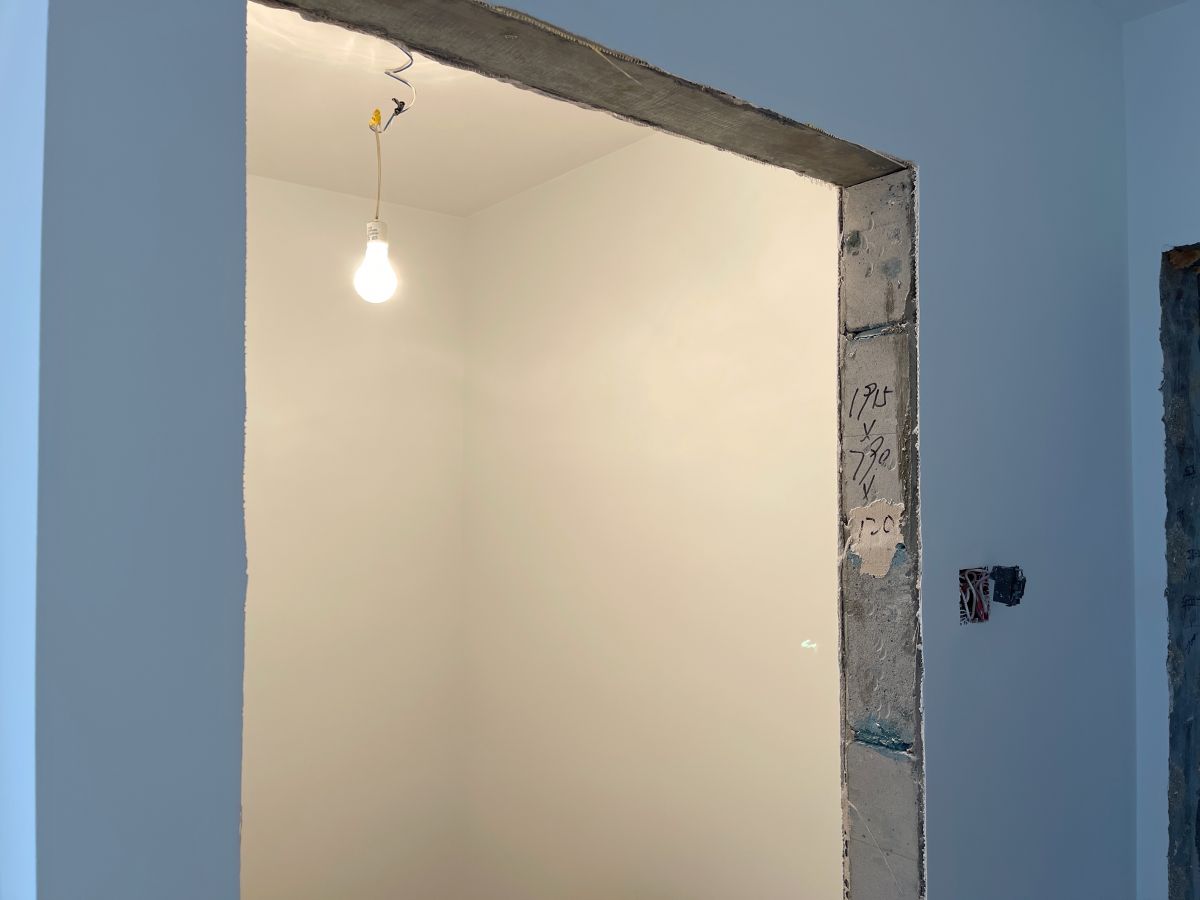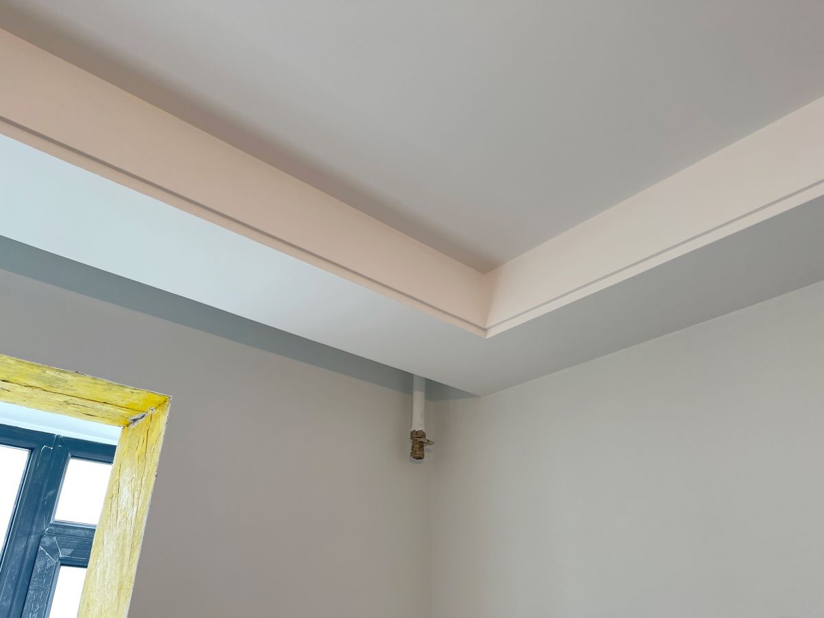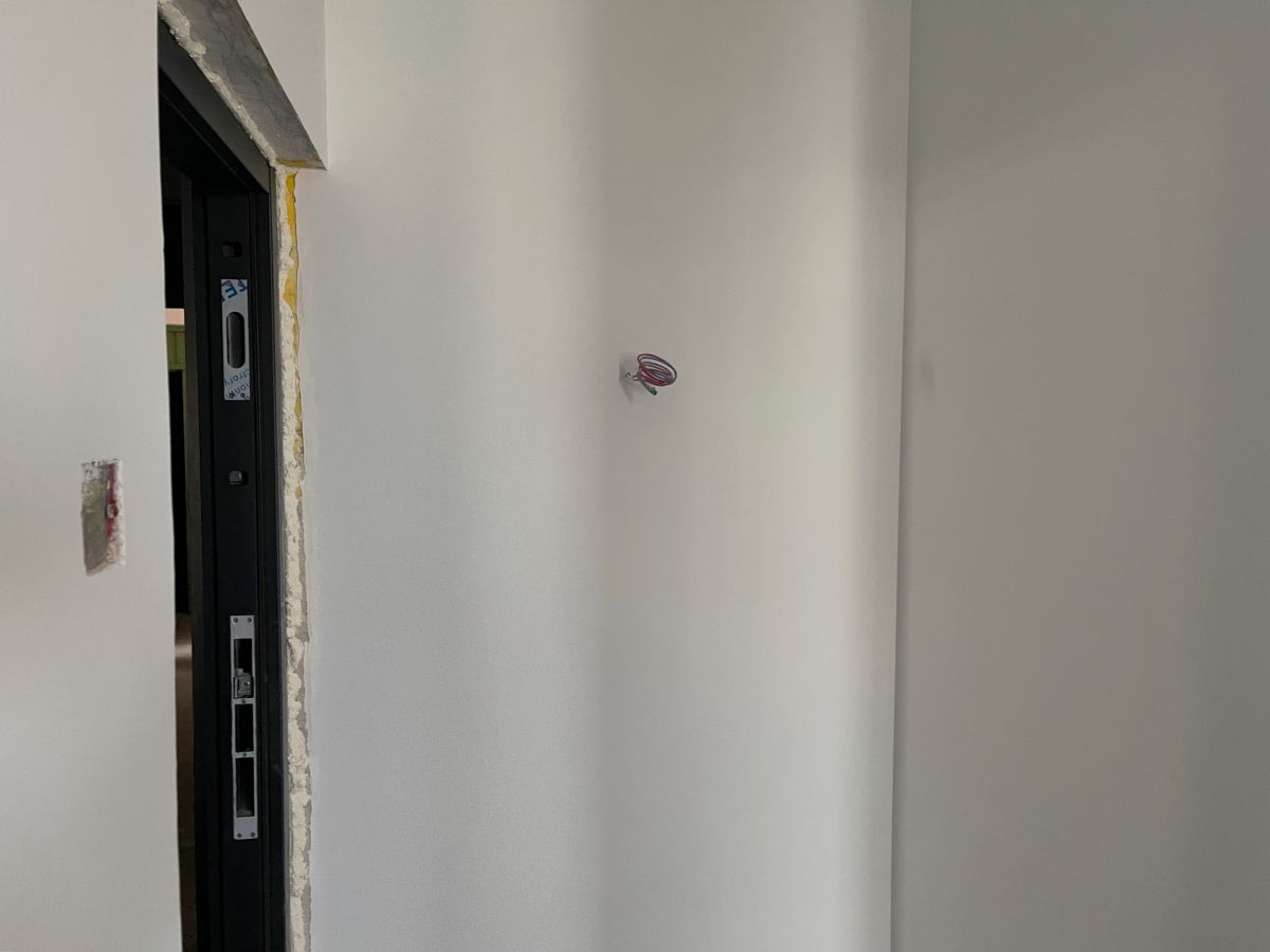 因為有貼墻的柜子,暫時未安裝踢腳線,同時為了配合柜子安裝,保證柜體與墻面緊密貼合、無縫隙,柜子從上到下嚴絲合縫,因此此處墻面做了垂平工藝。