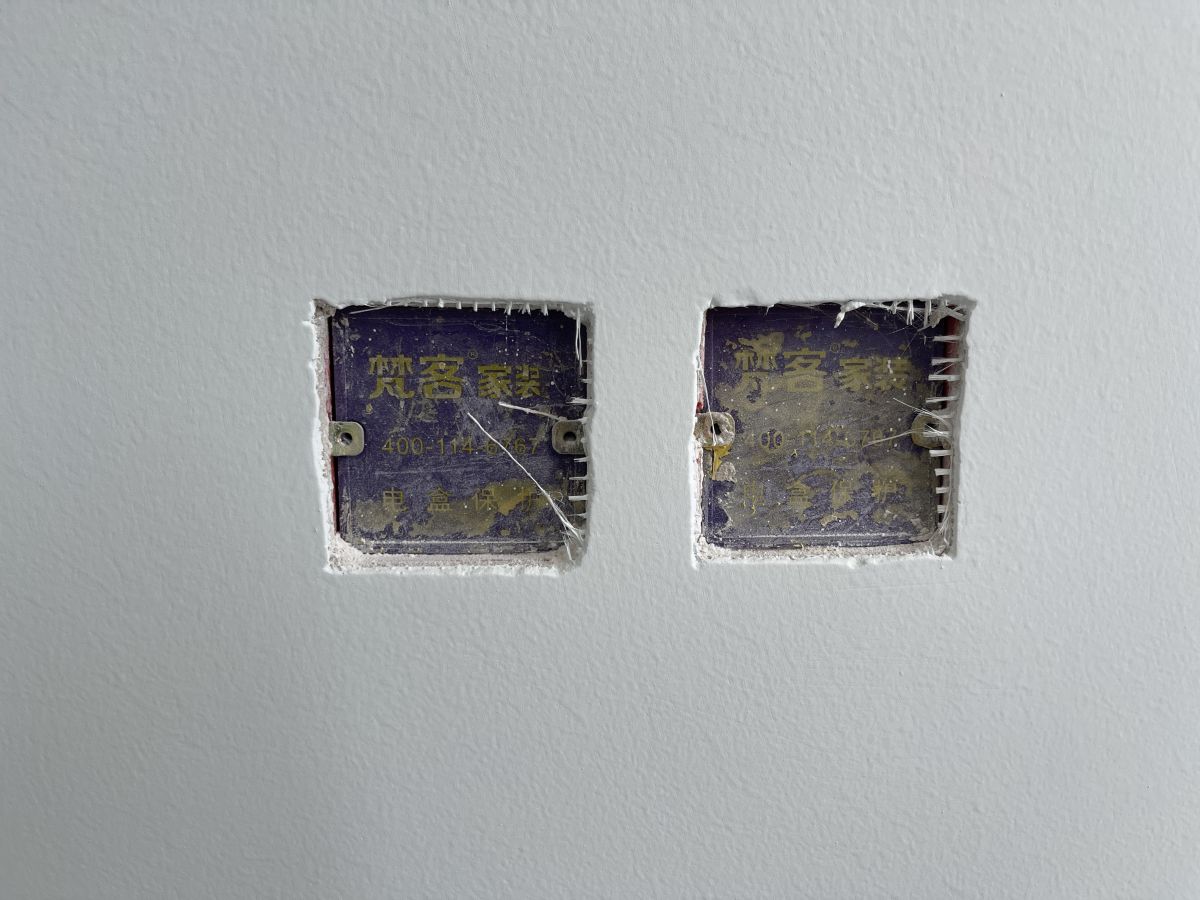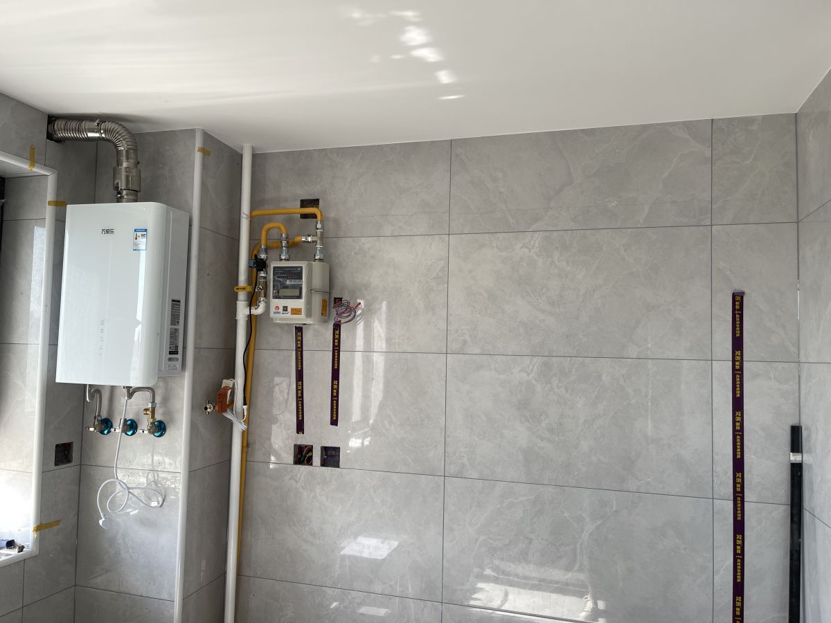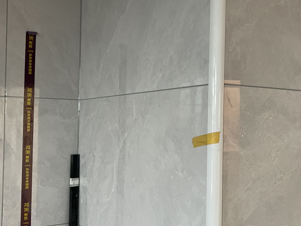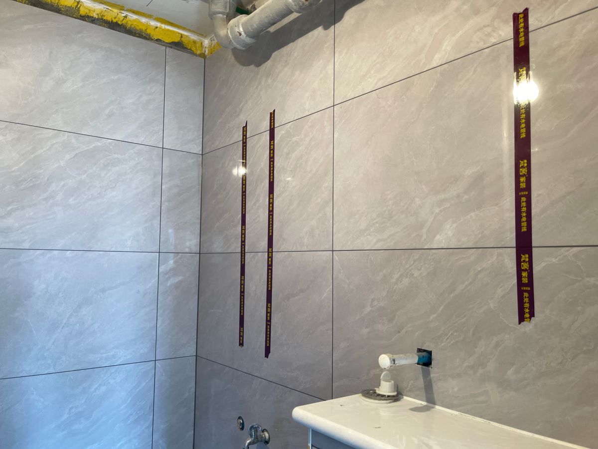 ↓ 墻面貼著水電標識貼,警示墻內是水電管線,避免后期安裝櫥柜、打眼、開孔時出現安全隱患。