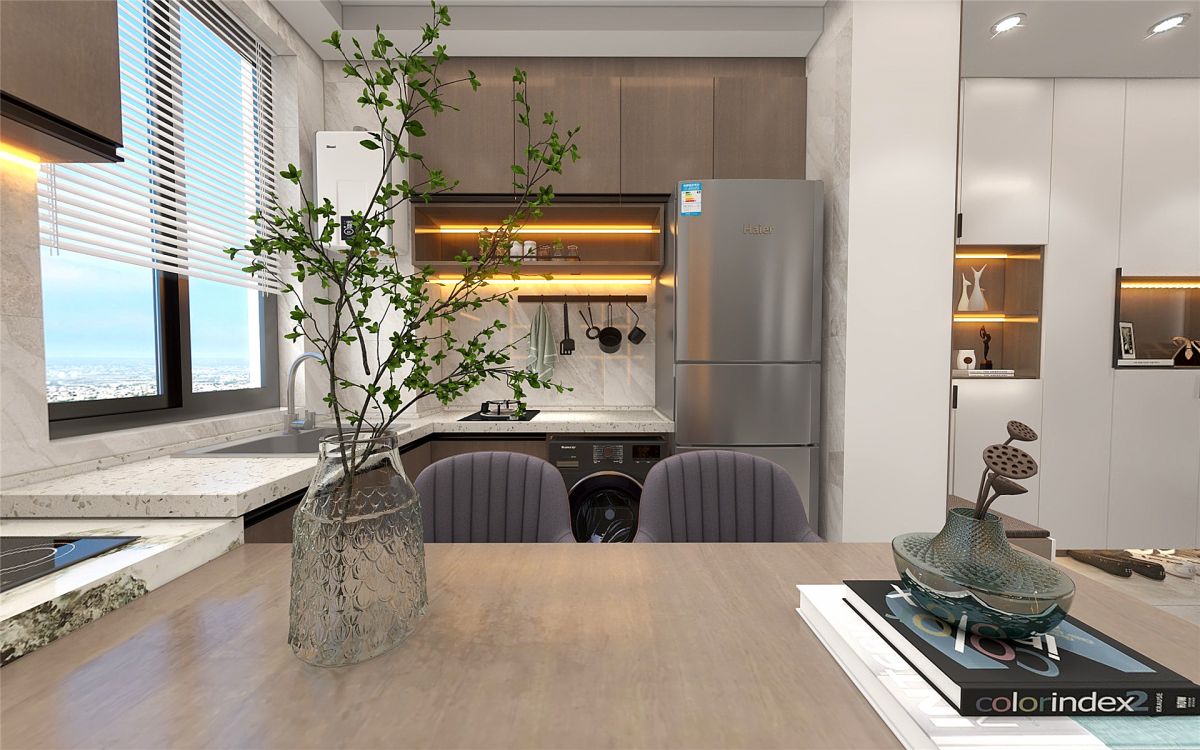 業主沒有太多復雜的烹飪需求,設計師設計了一個西式廚房,從灶臺→吧臺→書桌一氣呵成,整體又時尚,增加了功能區,提升了空間利用率。