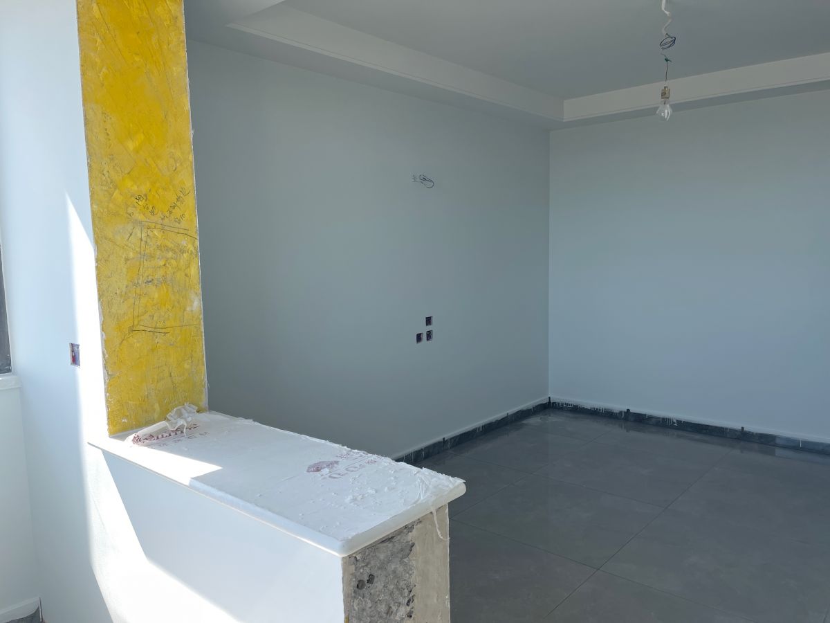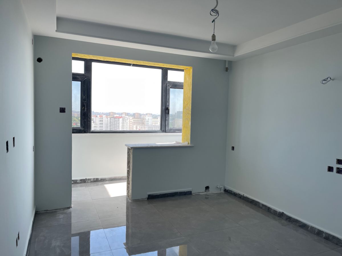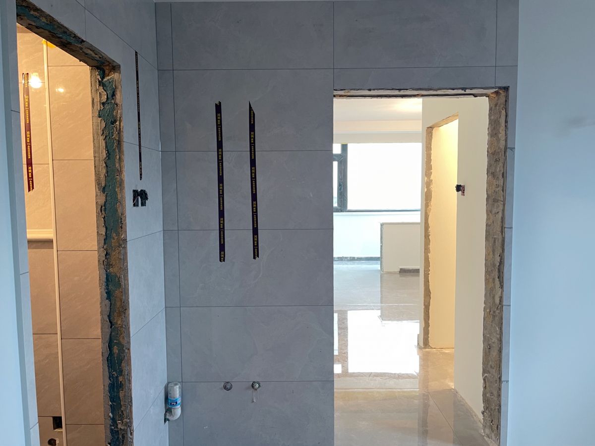 ↑ 廚房灶臺區,干凈整潔。墻面采用400*800的瓷磚鋪貼,時尚大氣,工藝嚴絲合縫。目前在等櫥柜進場,陸續還會有木門、潔具、燈具等進場安裝。