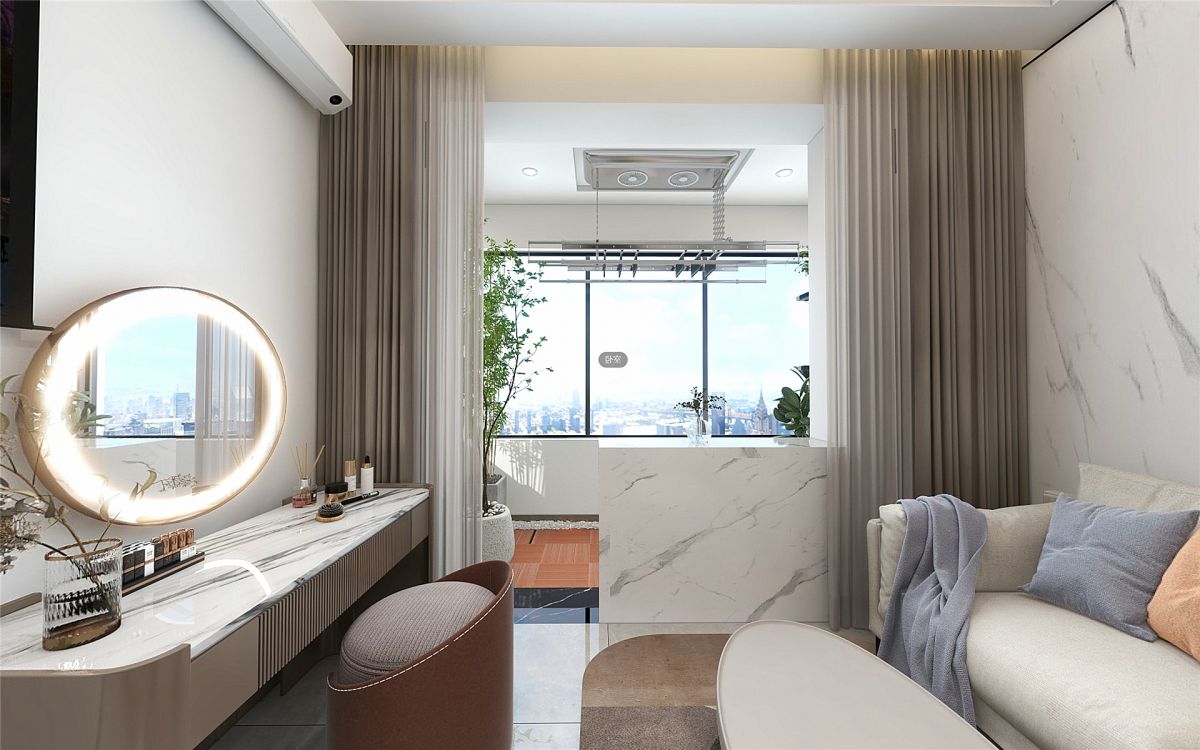 臥室+休閑區,靠墻的一邊是床,靠窗的一邊是沙發、電視。再打通陽臺與臥室之間的隔窗,改為吧臺,以淺色系為主基調,小空間更顯明亮,視覺通透感更強。從餐廚到臥室再到陽臺,地磚通鋪,沒有過門石,一鏡到底,空間敞亮。